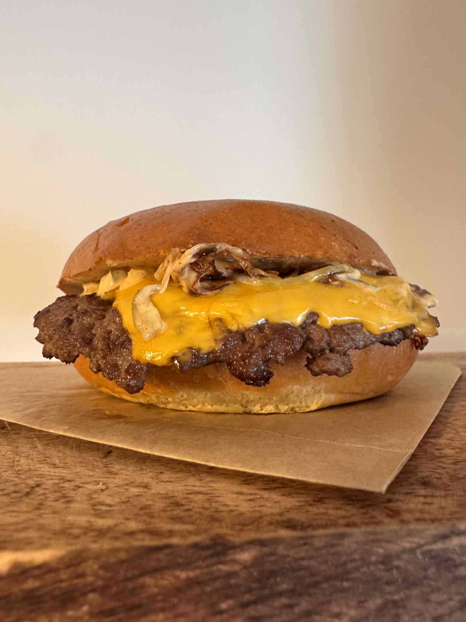 bułka maślana, soczysta wołowina 85g, ser Cheddar, cebula biała, autorski sos + opakowanie na wynos 2 zł